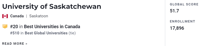 2022年USnews 加拿大大学排名中,萨省大学位于第20名。