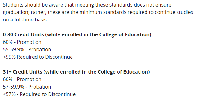 如果学生无法满足最低的学术要求,则会面临来自学校的学术处罚。根据已经完成的课程学位,当学生的平均成绩低于60%但高于55%(30个学分以内的课程)或者低于60%但高于57%(完成超过30个学分的课程),学生将被留校察看(Academic Probation)。一旦处于留校察看的状态,学生虽然可以继续留校学习,但必须尽快提高学术成绩,以避免更加严厉的学术处罚。如果学生的平均成绩低于55%(30个学分以内的课程)或者低于57%(完成超过30个学分的课程),则会被学校停学(Required to Discontinue)。停学时间通常为一年。