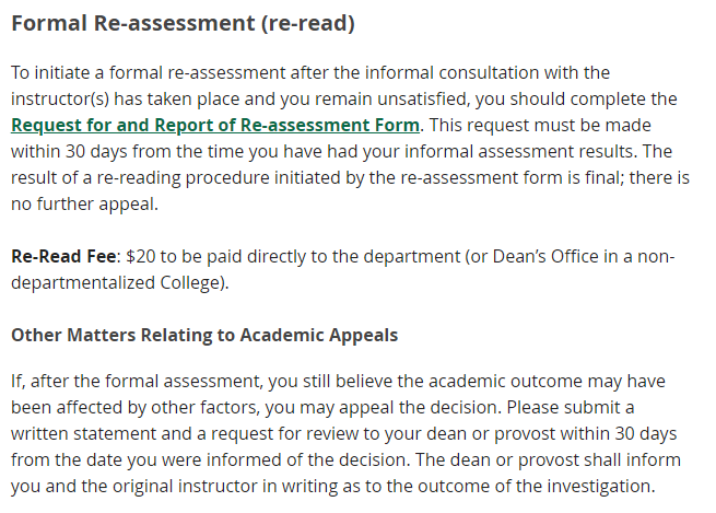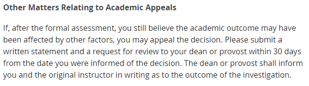 在与任课老师沟通后,如果学生认定自己的成绩依然存在错误或者异议没有充分解决,学生有权利提交正式的成绩申诉。关于成绩的申诉,学生需要在与任课老师沟通后的30天内提交至课程所在院系Dean’s Office。学生应该在申诉中详细解释申诉的原因,与任课老师沟通的过程,以及提交相应的证据和$20申诉费用。在收到学生的成绩申诉后,学院会组织相应的老师在充分调查后做出答复。