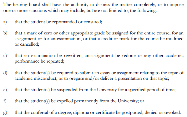 当学校收到关于学术不诚信的举报后,事件会首先交给Dean of the faculty来负责。在进行相应的调查后,如果确认学生确有违反学术诚信原则,则会给予相应的处罚。根据情节严重程度和学生过往诚信记录,学生有可能受到的处罚有:警告,成绩相关的处罚例如课业零分,课程不及格等,留校察看,停学,开除,甚至取消已经授予的学位等。