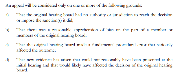 一旦学生因违反学术不诚信而受到处罚,学生仍然有申诉的权利。学生的申诉必须在收到处罚通知的30天内,以书面的形式向the University Secretary提出。申诉必须基于以下几种理由: