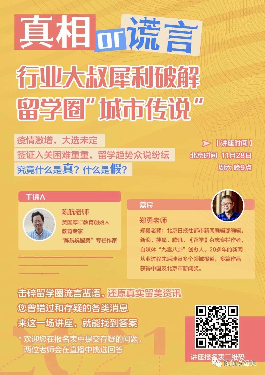 我是陈航,在美国生活20余年从事国际教育10余年,让我用事实告诉您,美国教育到底什么样。欢迎关注我的公众号:陈航说留美。