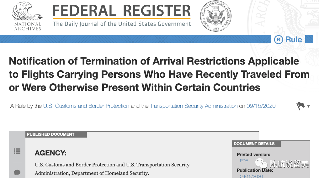 9月14日凌晨开始,美国国土安全局和美国海关边境总署,开始实施新的规定,解除中国大陆的旅行限制。