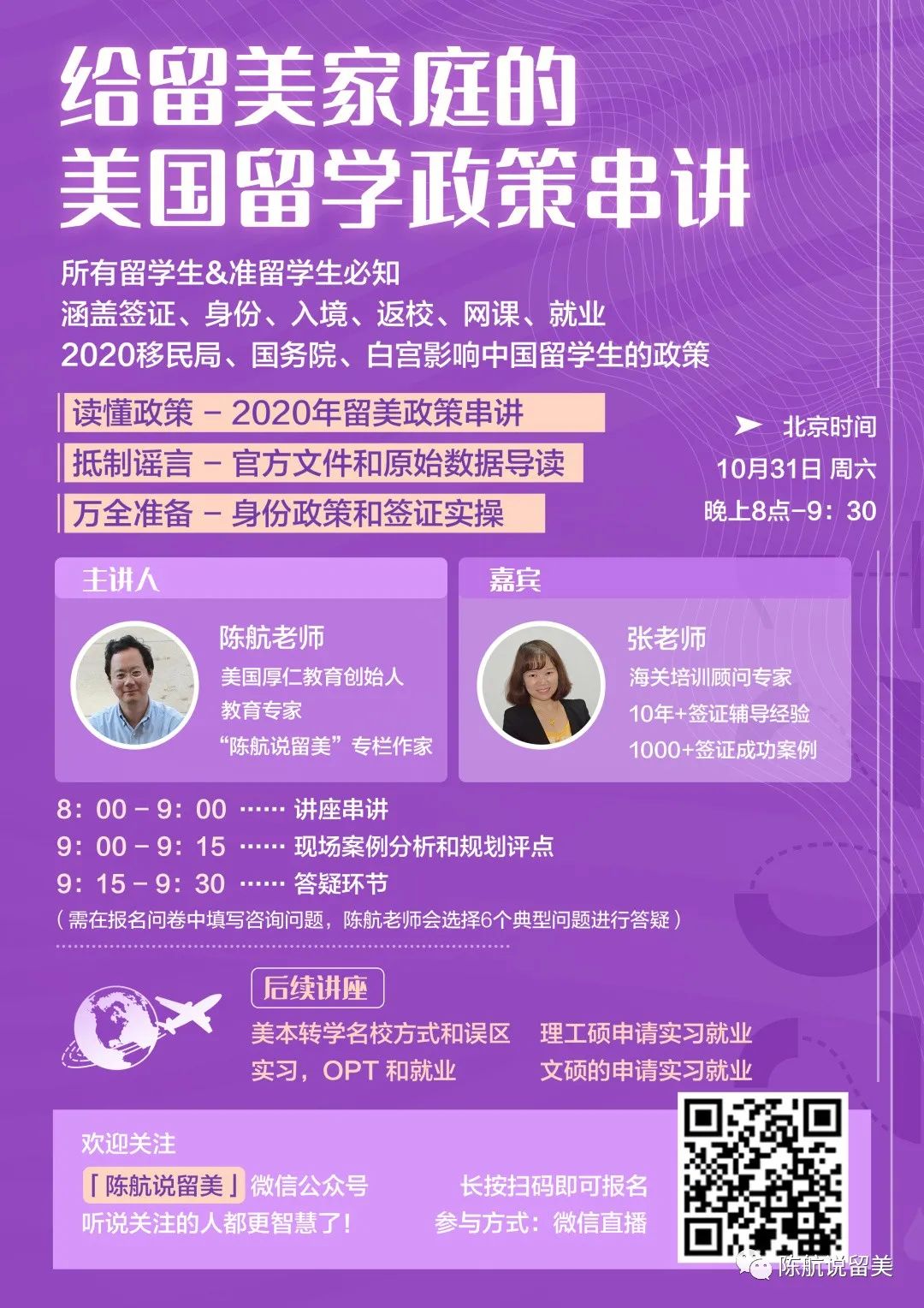 本周六北京时间晚8点,我会有一个针对2020-2021年留美政策的讲座,会涉及择签证、身份、入境、返校、网课、就业等内容,感兴趣的朋友可以扫描下方海报上的二维码报名参加,我会在报名表中选择6个问题进行现场分析和规划,欢迎大家报名参加。