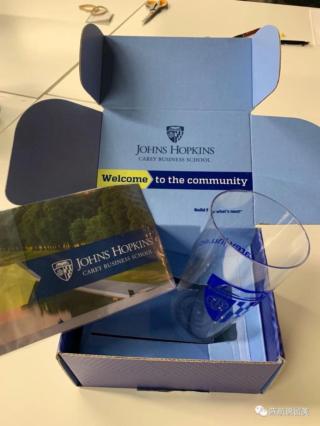桌上那个红盒子,是约翰霍普金斯大学的一个学院寄来的新材料。旁边的蓝盒子是送给我们的小礼物。