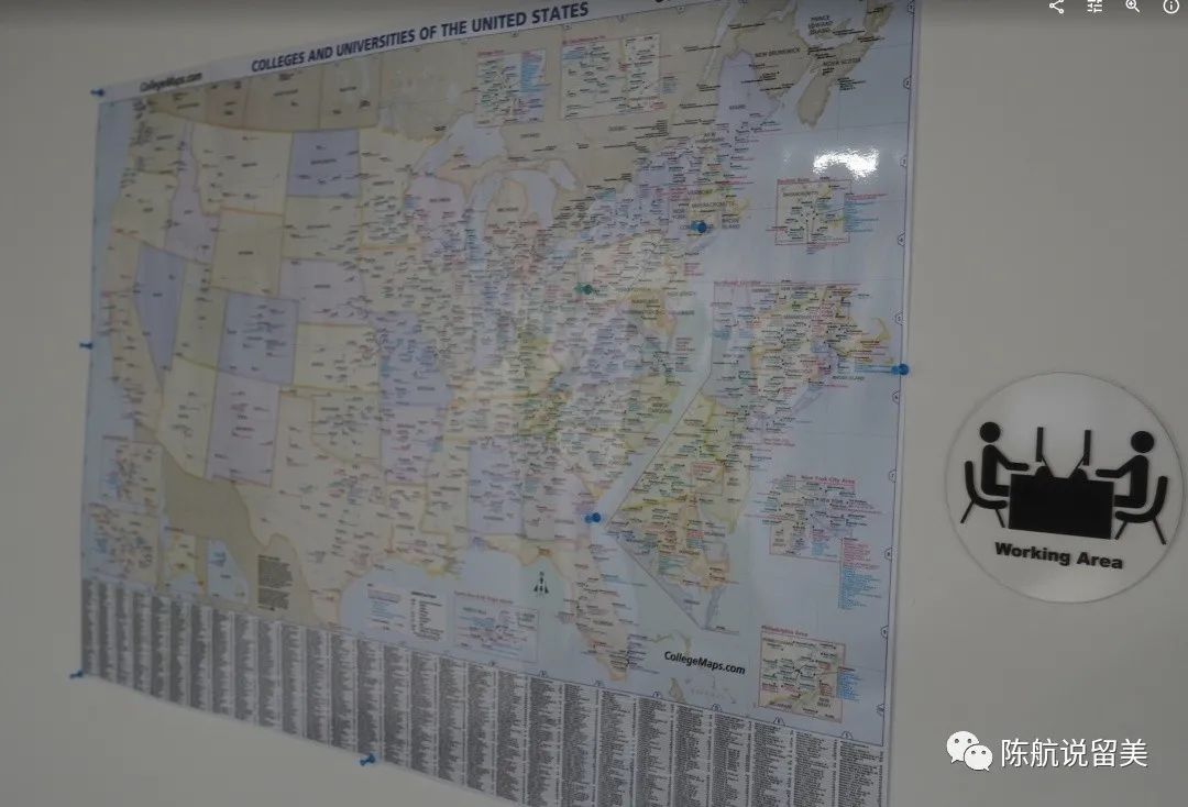 墙上有一张标记了所有美国大学的图。