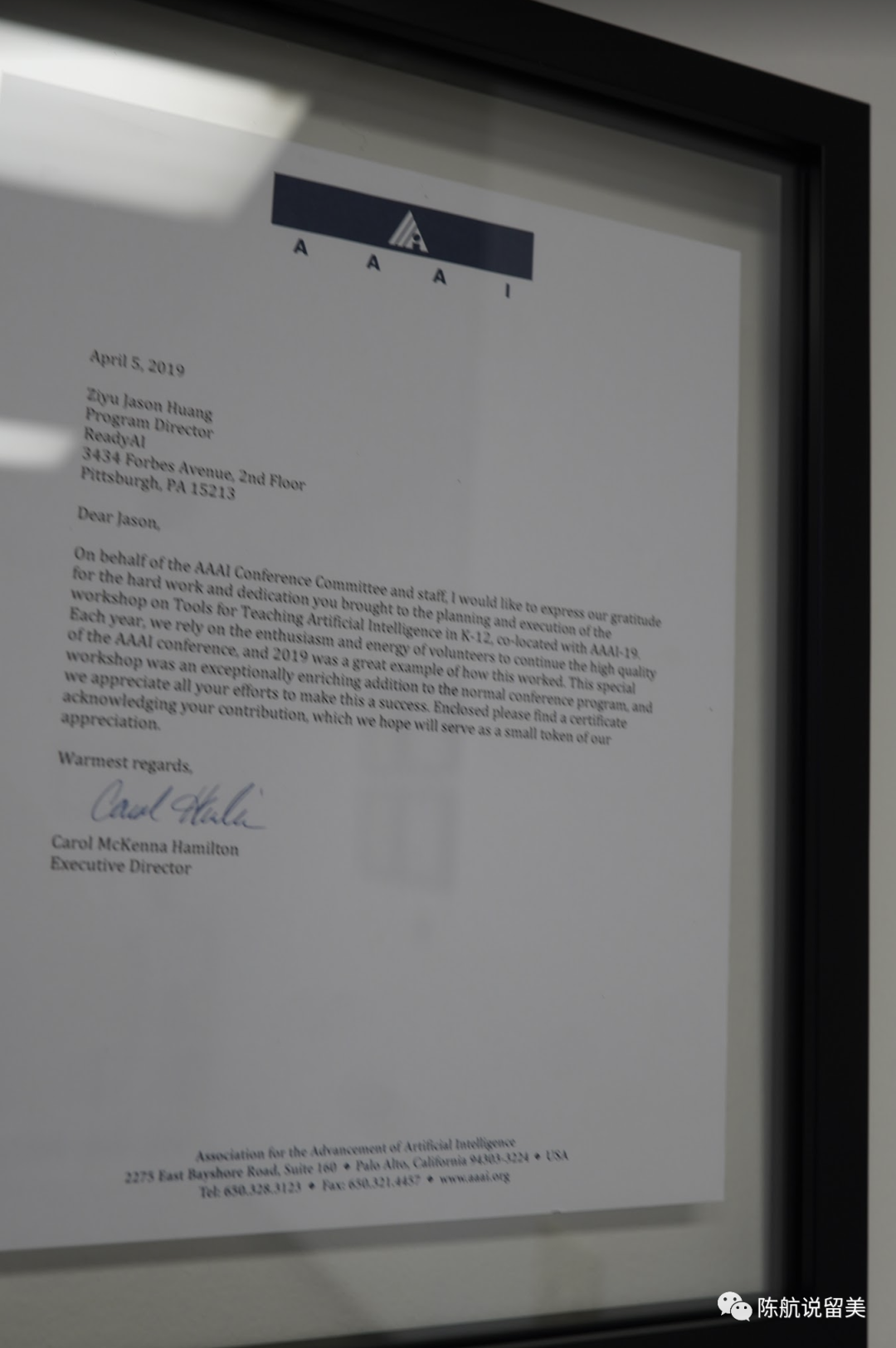 墙上挂着我们同事收到的行业协会的信。比如世界人工智能大会AAAI感谢ReadyA的I同事Jason的感谢信。