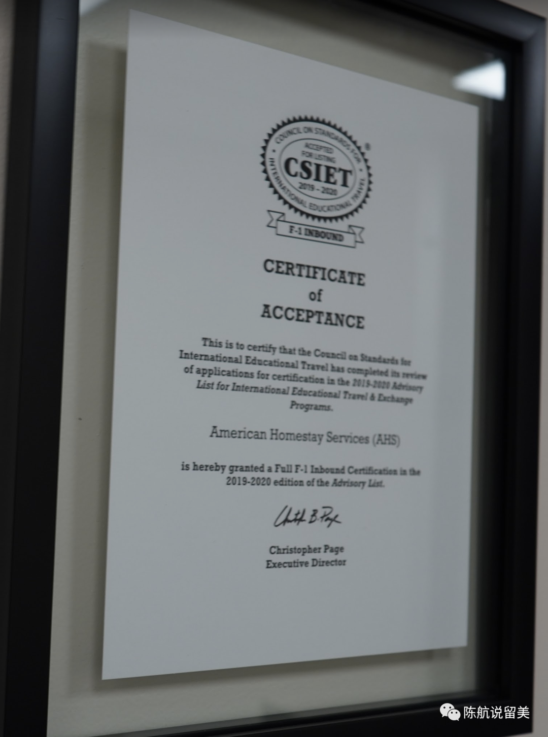 这是美国寄宿家庭服务中心AHS 得到的CSIET 认证。自动2014年,AHS 一直被CSIET认证。