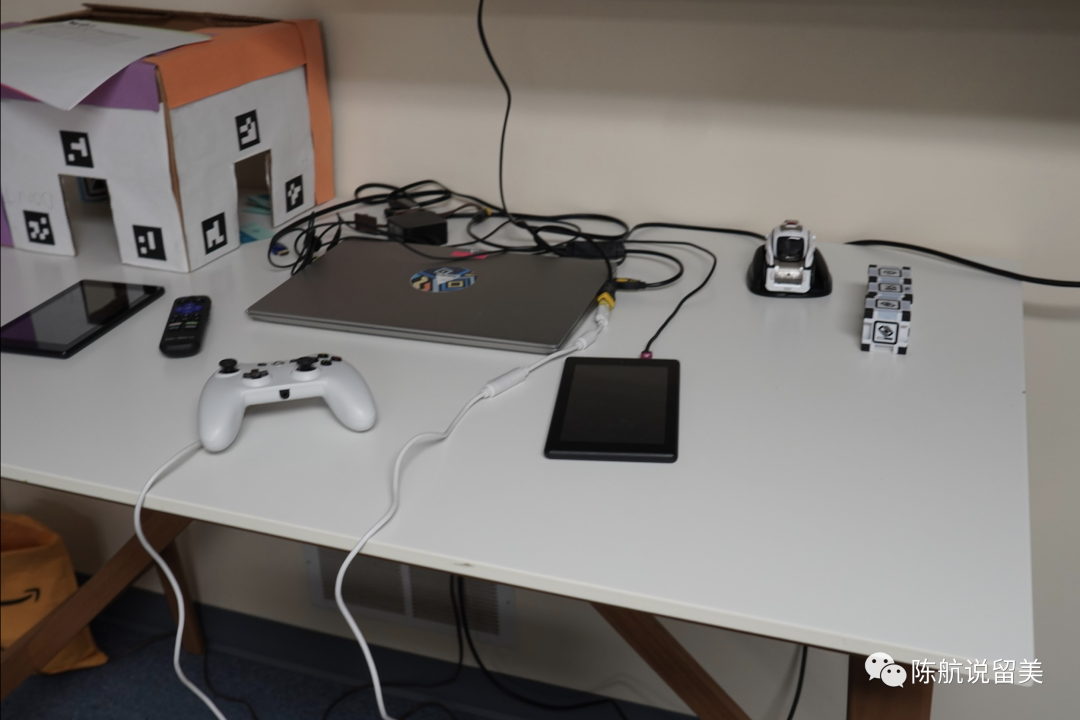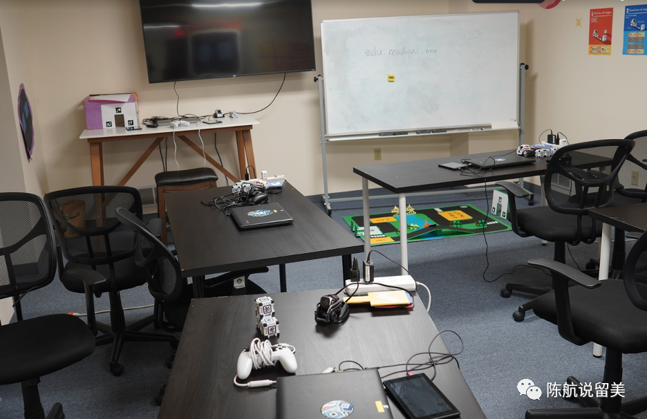 每个桌子上,有一套AI 学习的电脑,教具,机器人。