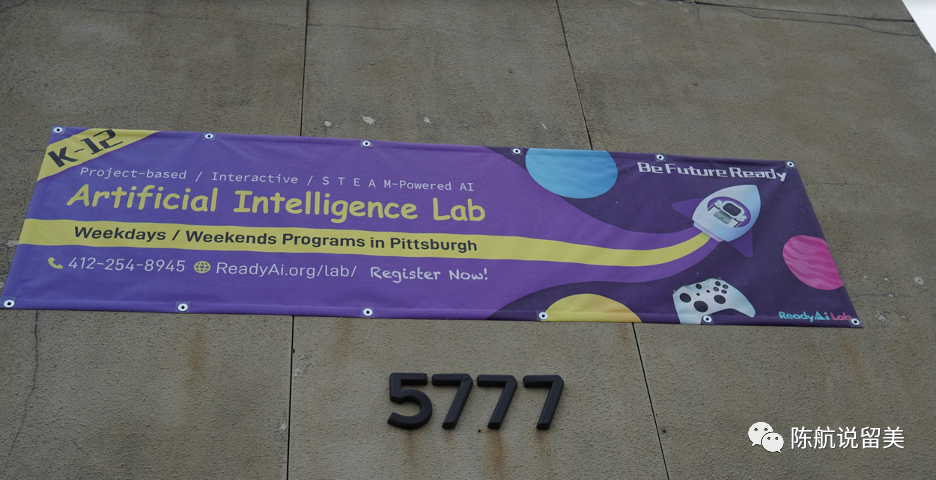 楼外挂着ReadyAI 人工智能教育实验室的招生启事。在这里,匹兹堡本地的学生通过基于项目的学习,来尝试课程,提供反馈。