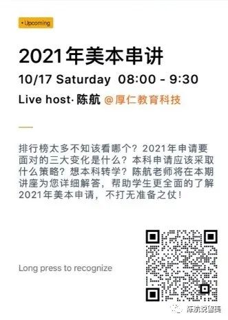 有些朋友错过了直播,或者部分内容没有及时听到,有需要的可以再次扫描下方二维码,即可观看回放。我在讲座中使用的PPT,已上传在厚仁云,在公众号后台回复关键词“2021美本”即可获得下载链接。