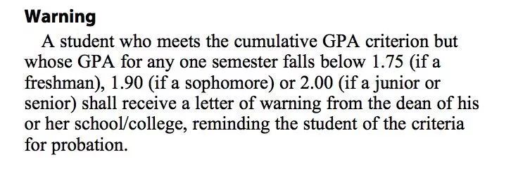 学生继续学习的资格取决于良好的学术地位(Good Academic standing)。大一学生维持Good Standing的最低标准是累积GPA及学期GPA不得低于1.75,大二学生累积GPA及学期GPA不得低于1.9,大三及大四学生累积GPA及学期GPA不得低于2.0。学生在任何一学期的GPA低于以上标准,将收到来自院长的警告(Warning)邮件。
