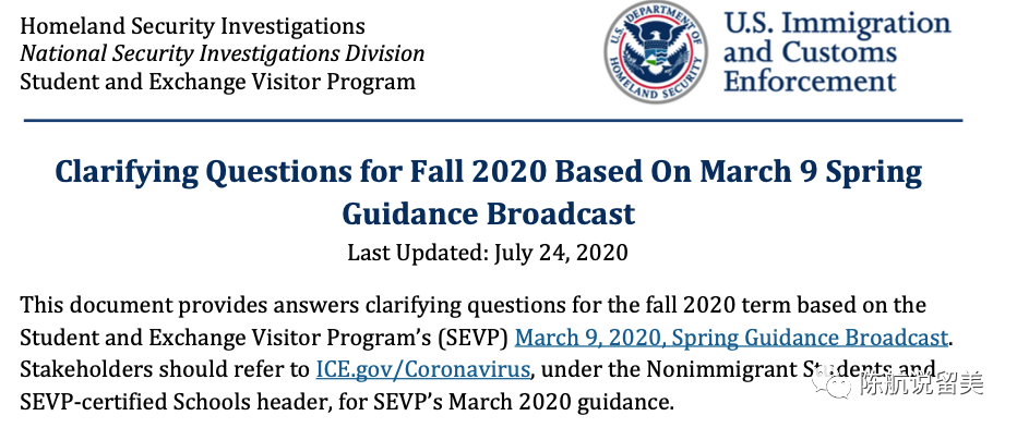 7月24日中午,美国移民局国际学生管理署SEVP,针对该信件,发布了对秋季学期的澄清。