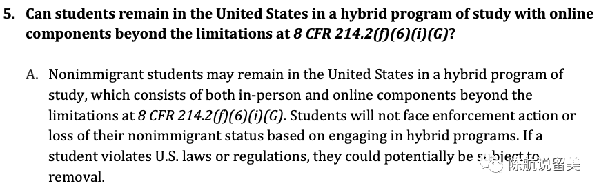 非移民学生可以留在美国的混合学习计划,该计划包括亲自参加和在线参加,超出了8 CFR 214.2(f)(6)(i)(G)的限制。学生不会因为参与混合计划而面临执法行动或失去非移民身份。如果学生违反美国法律或法规,则可能会遭到遣返。