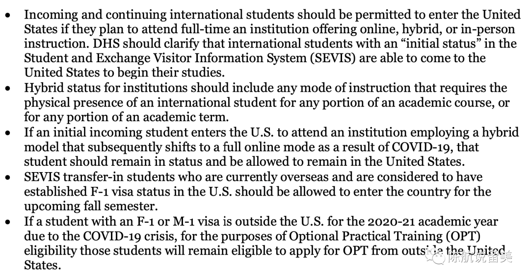 只有关于OPT是否能在海外申请这一条,在澄清里面没有提。看过我前面直播串讲(错过了移民局新规串讲直播?别急!看回播!还为您总结常见问题答疑!)的家长知道。实习OPT,涉及美国的劳工局,税务局,移民局,光是移民局国际学生管理署说了不算。所以,这个方面,还是按照老规矩,申请OPT时候,学生要在美国。这对大四,研究生最后一年的学生有影响。