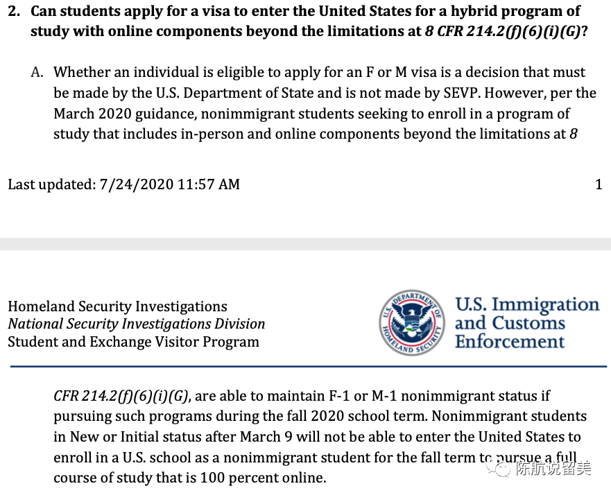 我在“陈航说留美”西瓜视频发了一则视频,讲解了7月22日美国教育协会主席ACE给移民局长的要求澄清的信件。视频如下: