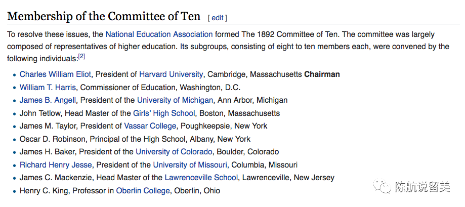 在哪里教解决了,那么教什么呢?高中的学科内容如何设置的呢?这不得不提一个美国教育历史上最重要的委员会之一:十人委员会。在1892年,为了规范教育,十人委员会成立,包括大学校长,高中校长,政府官员,大学教授。他们的目标只有一个:为美国的高中提供课程标准化的建议。