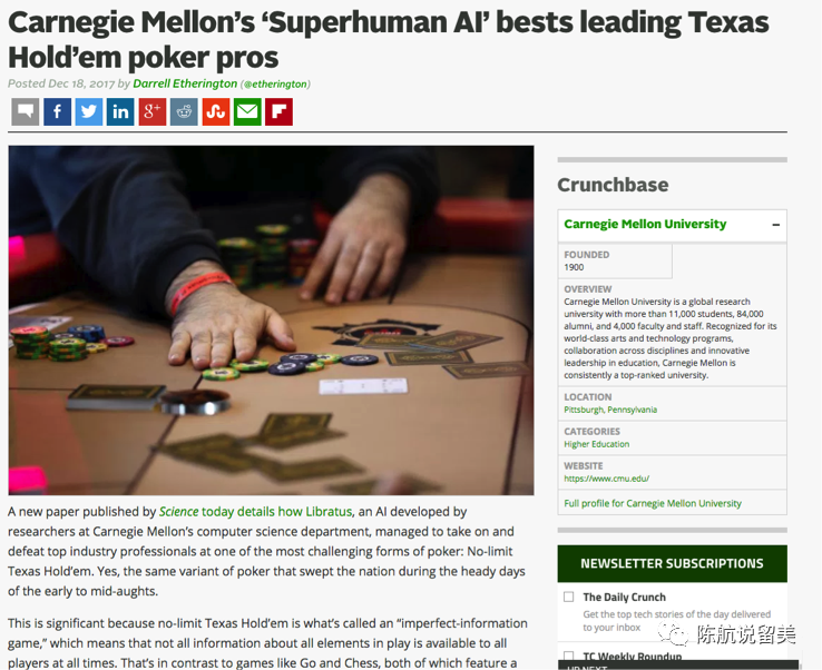 Sandholm教授说当时CMU的校友李开复找他,说是否能让Libertus在中国再比一次扑克。教授说,这个不是在美国比赛证明过了吗?李开复说,中国不同。在中国,可以有几百万人关注,而且中国的高手,更勤奋,更厉害。结果Sandholm教授接受了挑战,来到了中国,并且完全胜利了。李开复也没有食言,这场比赛,有超过三百万人在线上实时观看。