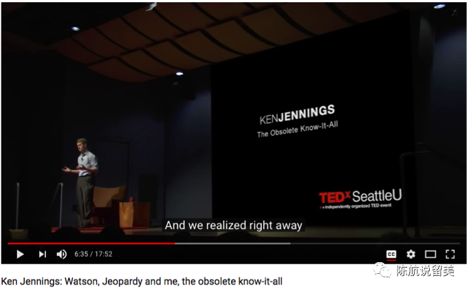 就在2011年2月14日,IBM的电脑华生 Watson 完全战胜了两个人类对手,其中一个是杰宁斯 Ken Jennings,Jeopardy 历史上获胜最多的选手,76次冠军!他儿时的一个梦想就是,在人们介绍他的时候,会说“76次智力竞赛冠军”,但是这次比赛以后,他说自己就只能是“被淘汰行业的冠军”了。他自己做了一个TED的演讲,题目就是“过时的全知道”。