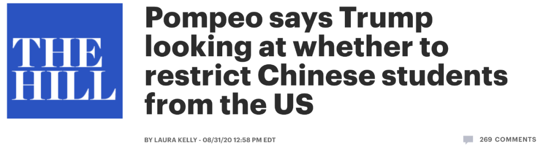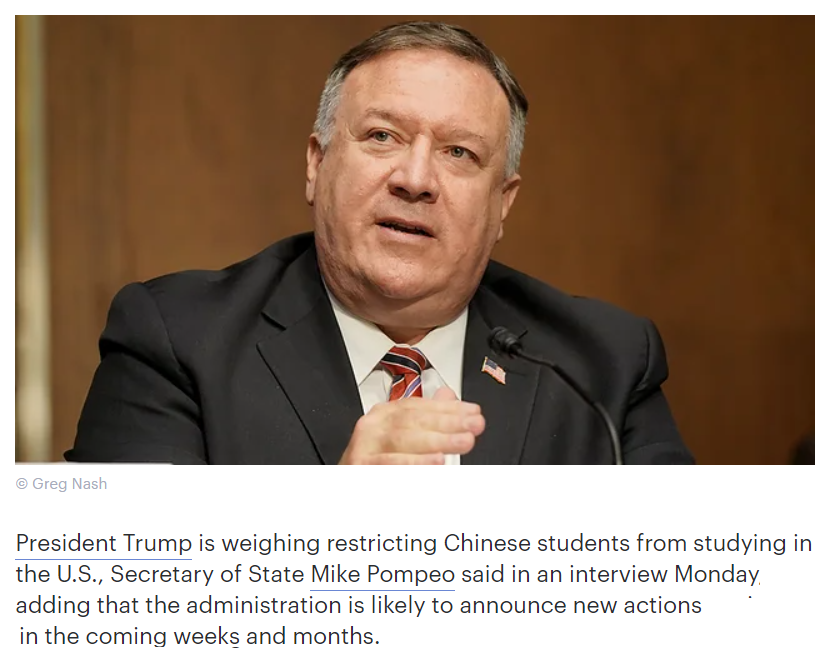 根据美国媒体国会山报道,蓬佩奥表示,美国方面将要限制中国学生赴美,甚至取消部分已获得的学生签证。