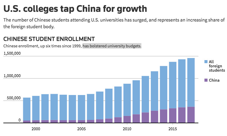 据路透社公布的数据显示,2017年中国在美留学生数量约363,341人,是1999年的6倍(54,466人)。