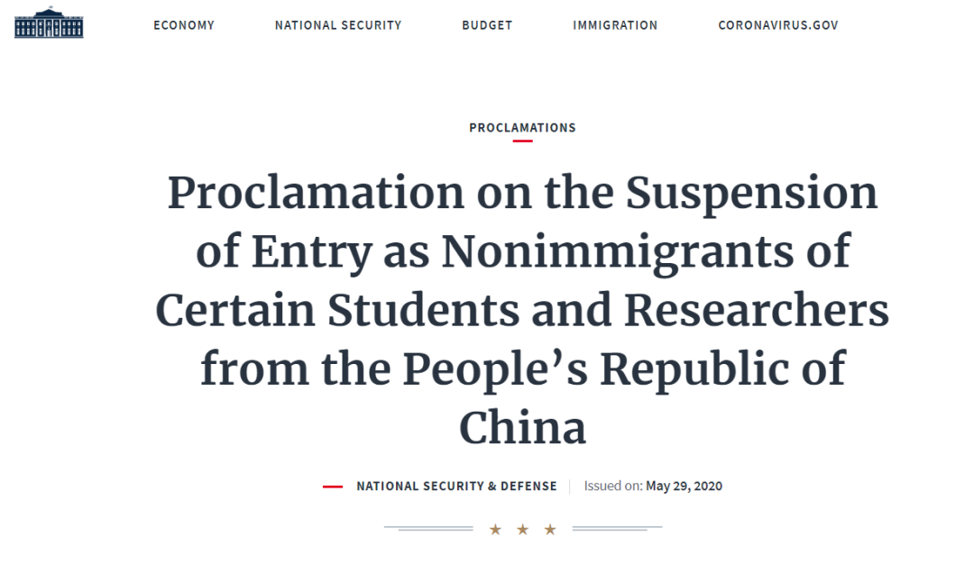 而在今年5月29日,美国总统特朗普曾签发了一则封杀部分中国留学生和学者的总统令:禁止任何与在中国从事“军民融合”项目的院校机构有关联的学生和学者,来美国进行本科以上的学习和学术研究。