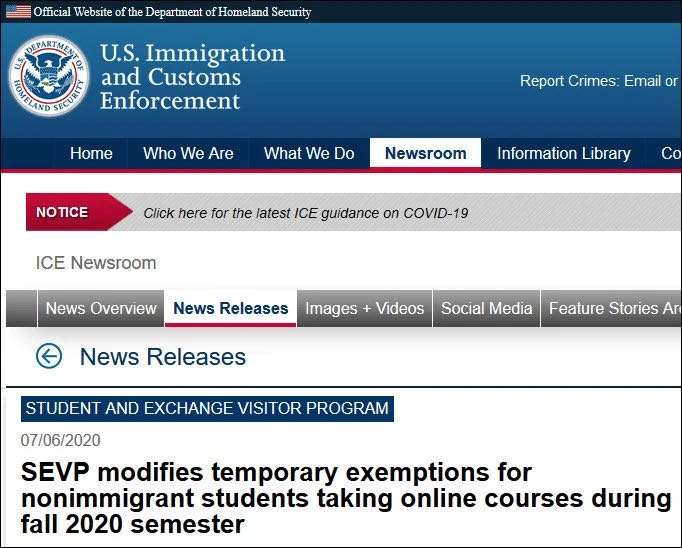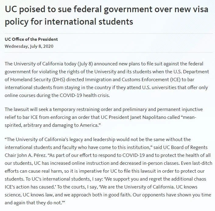 比如今年7月,那个突然上线的移民局新政上线,称“对于学校秋季学期只有网课的国际学生,美国将不发放F1签证甚至被驱逐出境”。