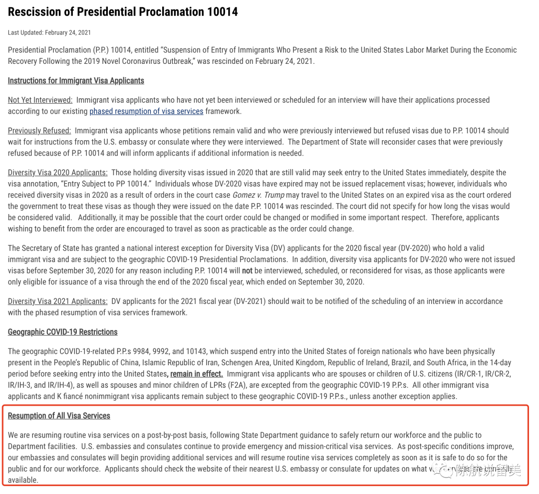 这是原文:“按照国务院的指示,我们将逐岗位恢复常规签证服务,以确保我们的员工和公众安全地返回到部门设施。美国大使馆和领事馆继续提供紧急和关键任务签证服务。随着特定岗位条件的改善,使馆和领事馆将开始提供额外服务,并在保障公众和我们员工安全的情况下尽快完全恢复常规签证服务。申请人应检查其最近的美国大使馆或领事馆的网站,以了解当前提供的签证服务的最新信息。” (https://travel.state.gov/content/travel/en/News/visas-news/rescission-of-presidential-proclamation-10014.html )