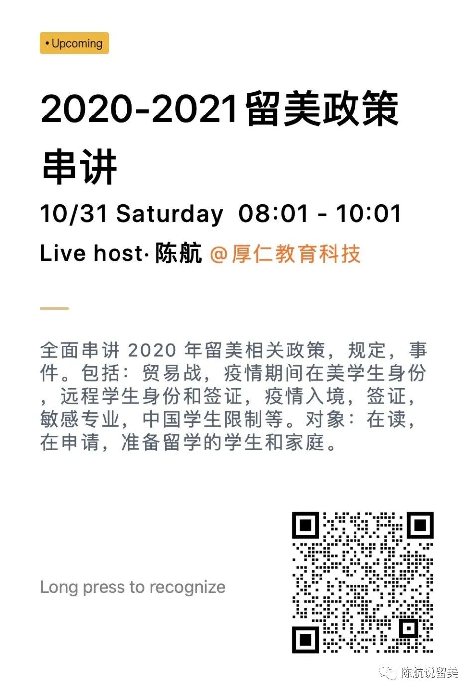 感谢各位家长同学观看了上周六的2020-2021留美政策串讲讲座,很高兴能通过这次讲座为大家讲解清楚包括签证、身份、入境等留美政策的问题。