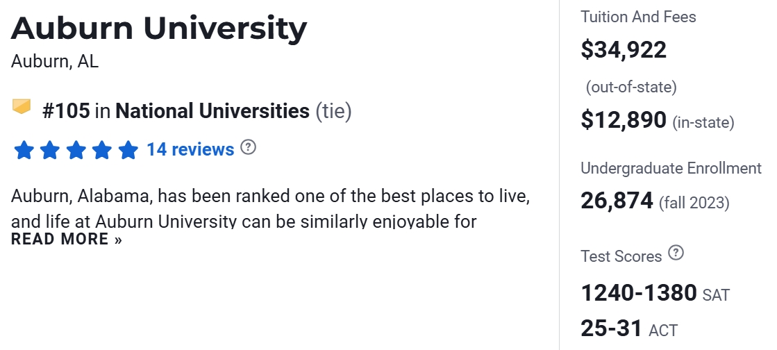 在2025年USNews美国大学排名中, 奥本大学 排名第105名。