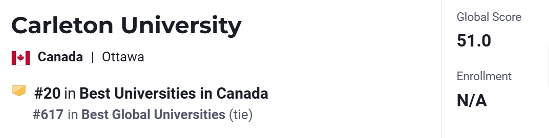 2025年USnews 加拿大大学排名中,Carleton University位于第20名。