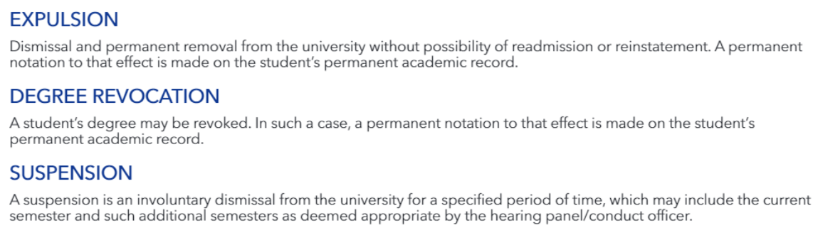 听证会:如果涉及纪律处分,被举报的学生/学生团体将被告知有案件相关信息和可能被指控的违纪行为,并给与做出回应机会。大多数此类的学术不诚信案件将通过听证会的方式作出判罚。如果案件性质严重,情节复杂,或学生之前有过违纪行为,则案件可能会被转交给学生行为委员会裁决,OSCCS将确定最适合采取的方案。