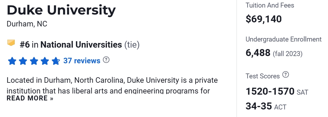 在2025 年USNews美国大学排名中,杜克大学排名第6。
