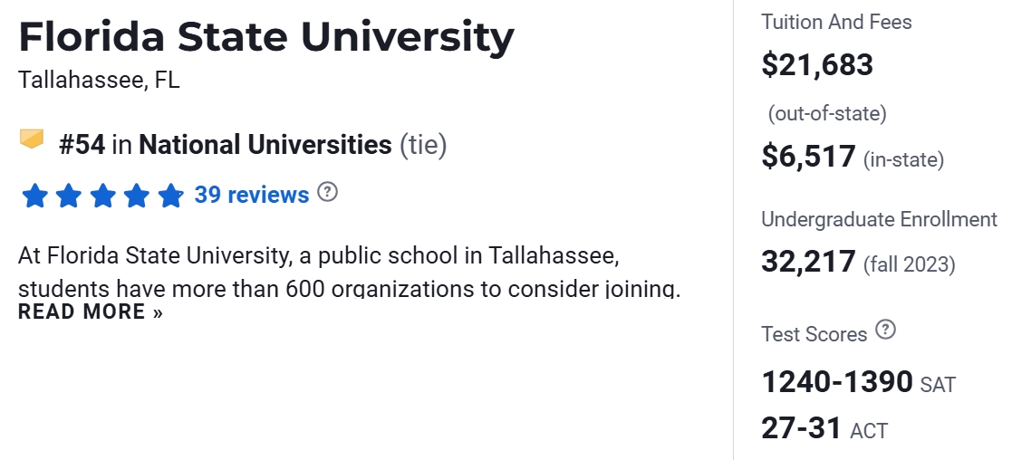 在2025 年USNews美国大学排名中,FSU排名第54。