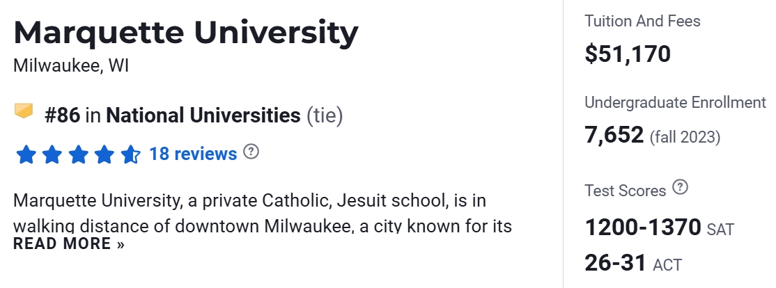 马凯特大学 (Marquette University,简称MU)成立于1881年,由密尔沃基市第一主教John Martin Henni创建。是美国顶尖的私立综合性天主教大学,同时也是美国最大的天主教耶稣会大学之一,威斯康辛最大的私立大学。