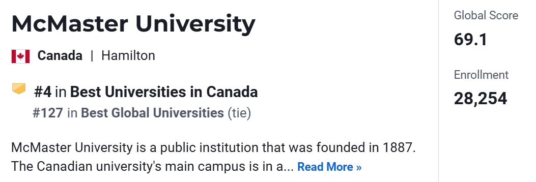 在2025USNews加拿大大学排名中,McMaster University位于第4名。
