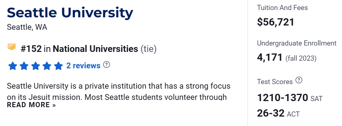 在2025 US News美国大学排名中,西雅图大学位于第152名。