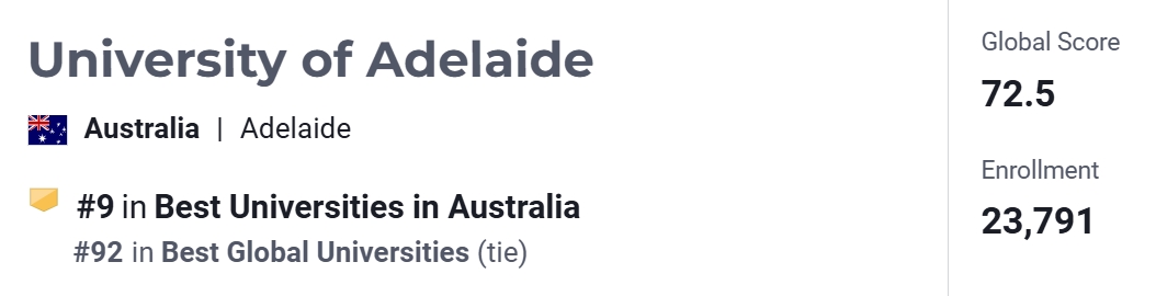 2025年, University of Adelaide位列U.S. News全澳第9、世界第92位。