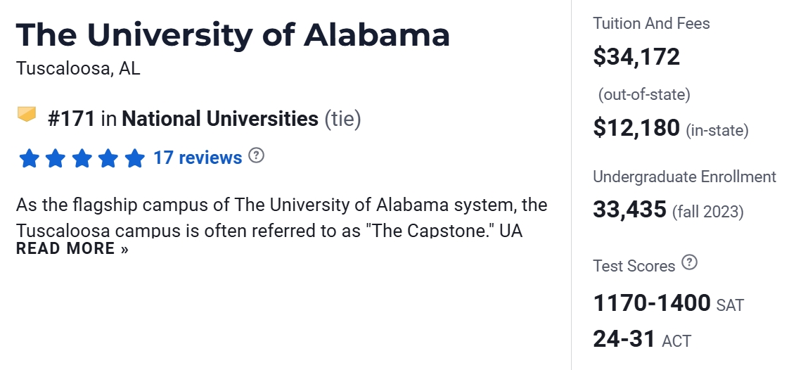 阿拉巴马大学的橄榄球队Crimson Tide是美国最富盛名的大学橄榄球队之一,在2009,2011和2012三年的全美大学生橄榄球比赛中夺得冠军。此外,由于所在地区的关系,阿拉巴马大学与NASA建立合作关系,在航天工程领域取得了许多备受瞩目的研究成果。