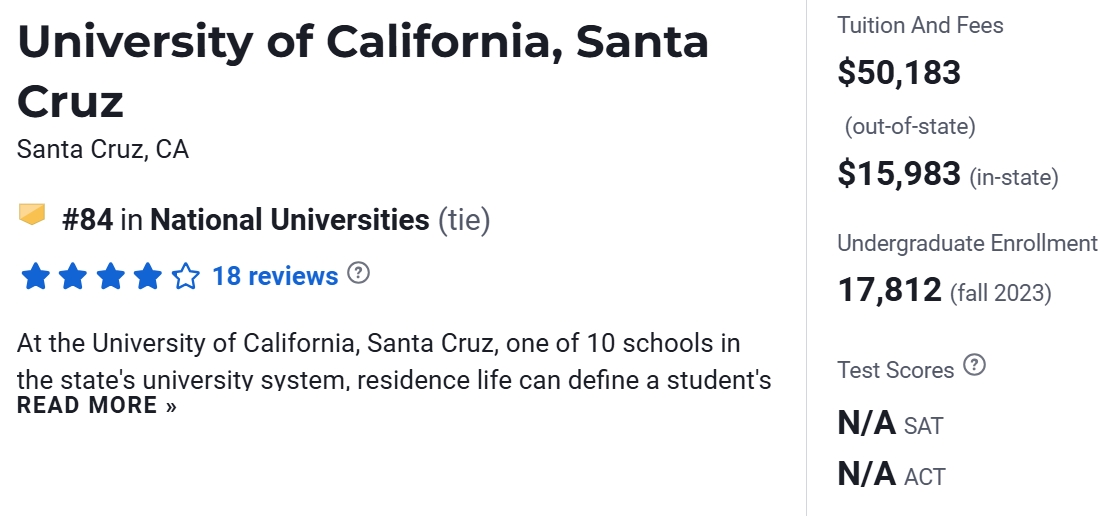 在2025 US News美国大学排名中,UCSC位于第84名。
