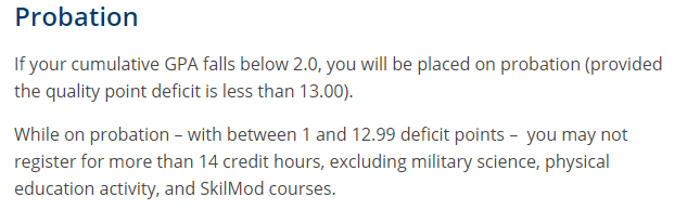 当学生的累积GPA低于2.0时,学生将被留校察看(Probation)。一旦学生被留校察看,学生应当引起重视,尽快提高自己的成绩,避免更加严重的处罚。在接下来的学期内只能注册不超过14个学分的课程。同时,学校还会要求学生积极的与Advisor交流,寻求提高成绩的方法。