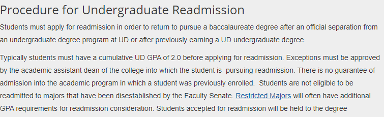 如果校方最终做出开除的决定后,学生需要停学一段时间(通常为一年)。在停学结束后,如果仍希望回到UD,可以申请Readmision。但是学生必须证明自己有能力达到UD的学术要求并顺利完成学业。通常,学生需要提供停学期间的成绩,并满足GPA 2.0或以上的要求。