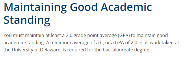 特拉华大学 对成绩的计算采用常见的GPA 4.0方式。学校要求本科生必须保持累积GPA在2.0或以上才能满足最低的学术要求,即被视为学术良好(Good Standing)。在每个学期结束,学校都会统一对学生的成绩进行计算和统计。如果成绩不达标,则会收到相应的学术处罚。