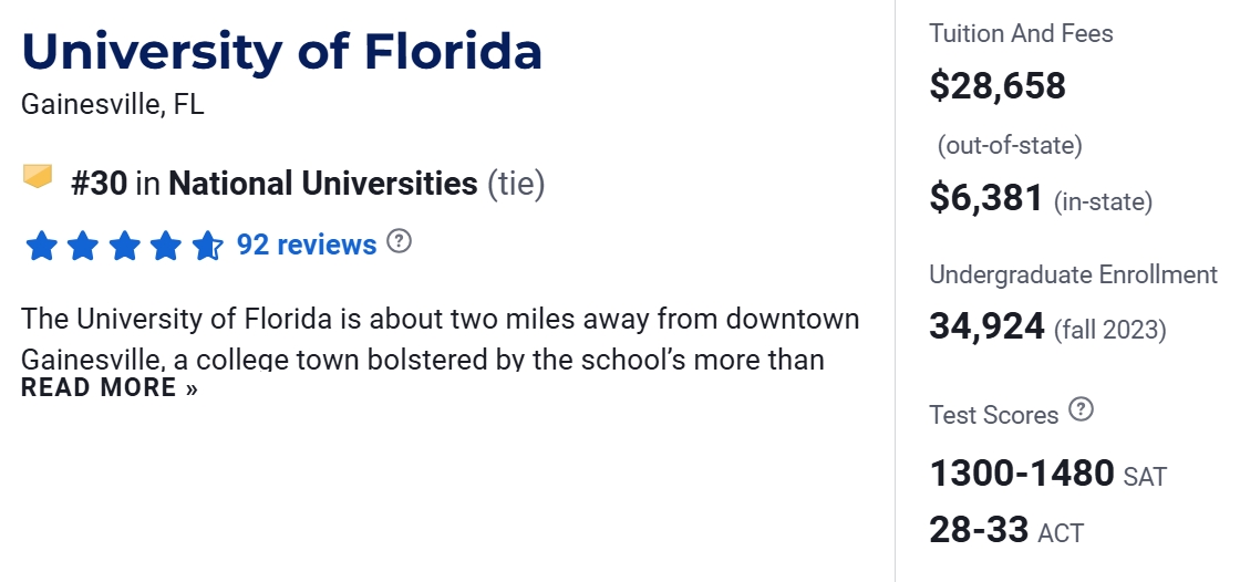 在2025年US News美国大学排名中,佛罗里达大学排名第30。