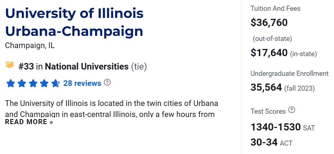 该校一直致力于卓越的研究、教学和公众参与,取得了很多奖项荣誉。校友和教授中有30位获得诺贝尔奖,25位获得普利策奖,这在美国公立大学中仅次于加州大学伯克利分校。该校拥有全美第二大大学图书馆,仅次于哈佛大学。在2025 US News美国大学排名中,UIUC位于第33名。