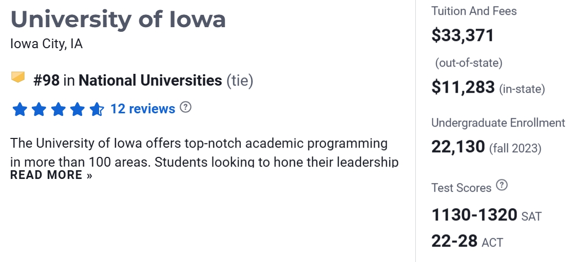 在2025 US News 美国大学排名中,U-Iowa位于第98名。