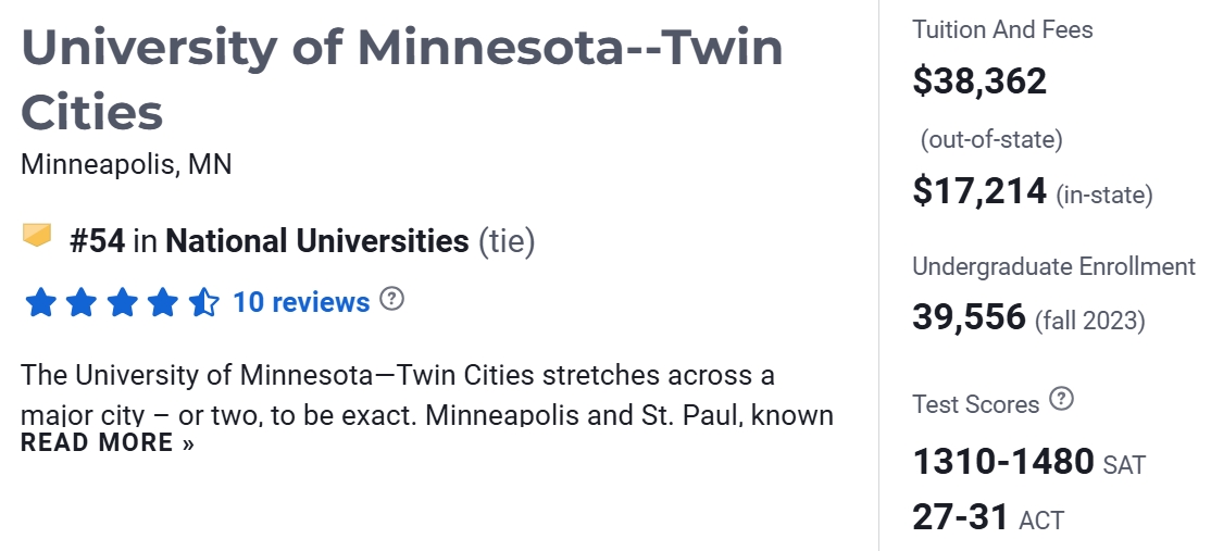 明尼苏达大学 双城分校 (University of Minnesota, Twin Cities)简称U of M或UMN,通常指明尼苏达大学双城校区, 是全美最具综合性的大学之一,也是一流的本科、研究生教育学府和研究机构。双城分校位列美国高校十大联盟(Big Ten),同时也被誉为“公立常春藤”。2025年USNews美国大学排名中, 明尼苏达大学 双城分校排名第54。