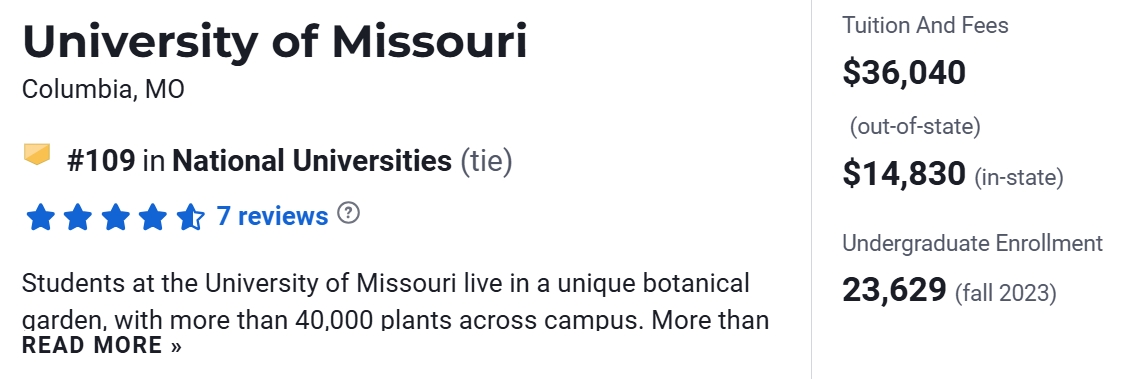 密苏里大学哥伦比亚分校是密苏里大学University of Missouri Columbia系统中的主校区,也是实力最为强大,名声最为显赫的校区,与同州另一私校圣路易斯华盛顿大学并称。同时,它也是34所公立美国大学协会AAU(Association of American Universities)的大学之一,是该州唯一一所同时兼为美国大学协会会员和卡内基高等教育基金会评出的“博士科研/横向研究型大学”。放眼全美,获得同等双料头衔的大学也不过三十余所,故素有“公立常春藤名校”的美誉。