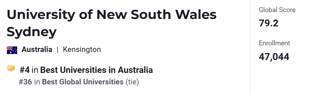 2025年,新南威尔士大学位列U.S. News全澳第4、世界第36位。