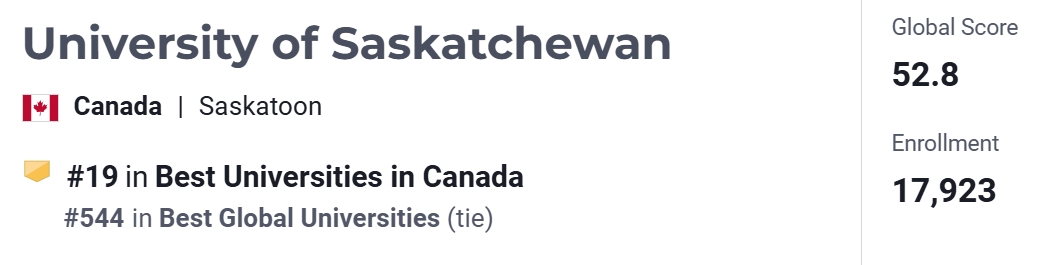 2025年USnews 加拿大大学排名中,萨省大学位于第19名。
